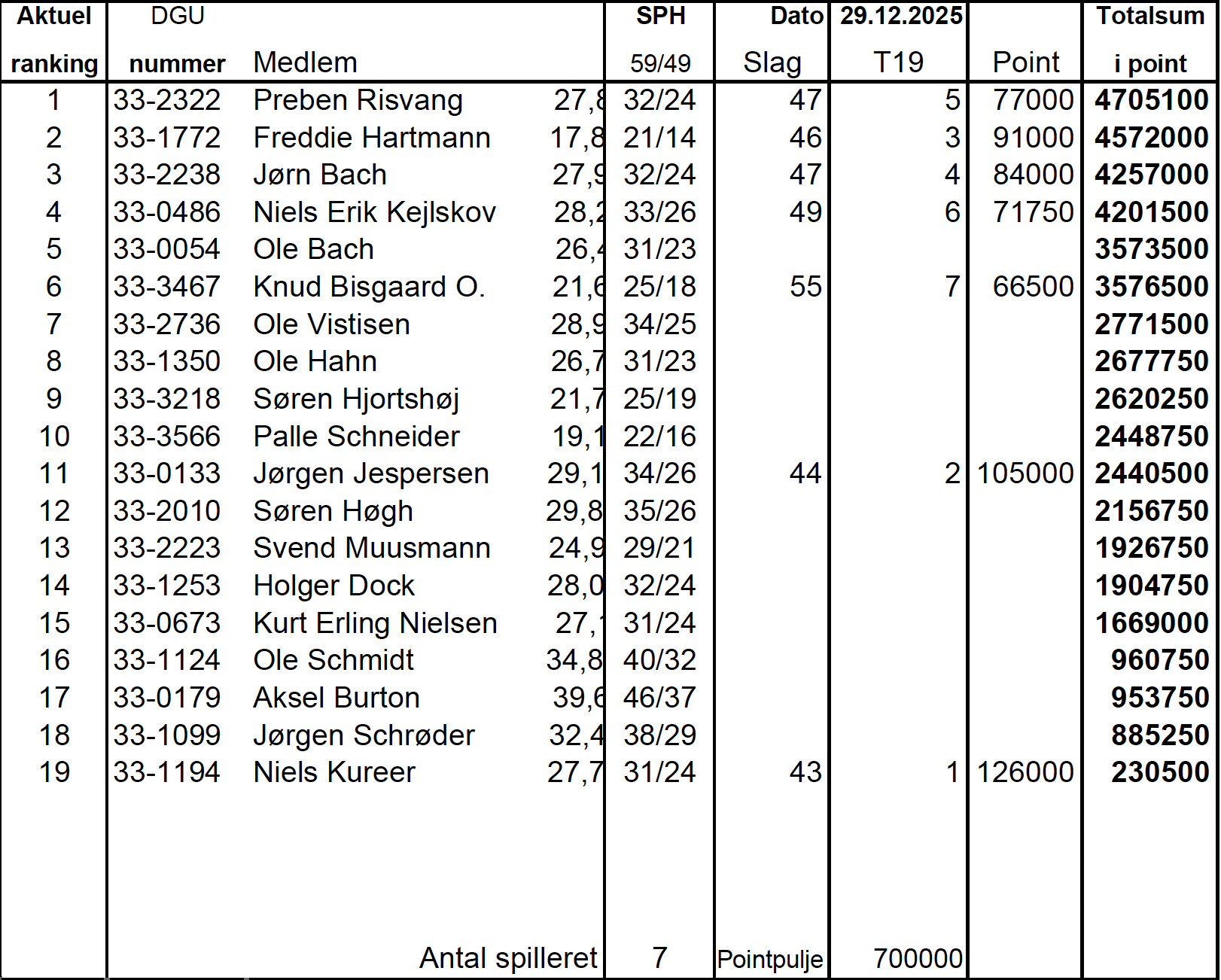 Palle's imponerende score rykker ham 2 pladser op i den samlede stilling, så "keep goin" Palle. Blandt de øvrige 6 spillere, dvs. Knud, Søren og Ole B, rykker alle tre 1 plads frem.