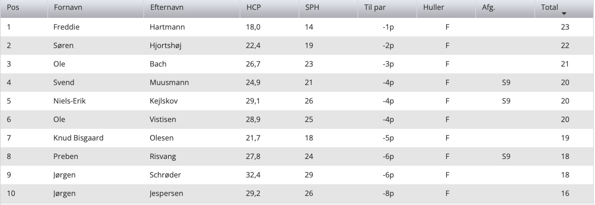 Runden blev spændende, alle score var under handicap og Søren Hjortshøj kunne for 2. gang have vundet runden, men i lighed med runden den 9. marts valgte Søren at slå til en anden spillers bold og få 2 straffeslag og dermed kunne Freddie Hartmann vinde med 23 point, Søren opnåede 22 point. Banen stod flot og på trods af måtter blev spillet god golf på hurtige greens. Her kan nævnes, at Jørgen Schrøder lave par på hul 3 og Svend Muusmann på hul 6.