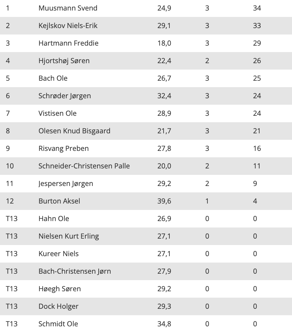 Efter tre runder ligger Svend Muusmann og Niels Erik Kejlskov på en delt 1. plads - begge har vundet en runde - 12 spillere har deltaget i turneringen og der er ikke større spredning i tabellen end der med gode scores / mindre gode scores kan vendes op og ned på stillingen.