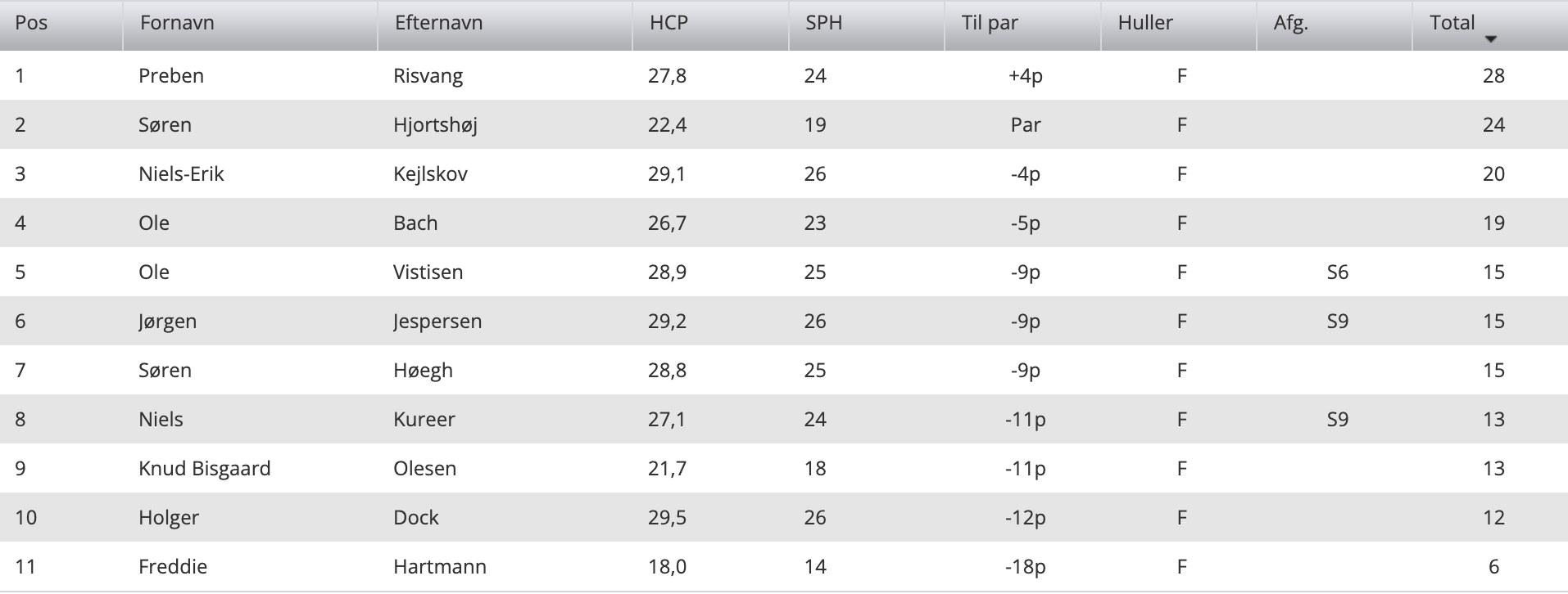 Vi var 12 tilmeldte, men en faldt fra og så var vi 11 tilbage ved lodtrækningen og som spillede på en god bane med hurtige greens. Der blev derfor også lavet gode scores af to spillere, som gik til deres handicap eller bedre - Preben Risvang blev 1'er med en score på 28 point - flot - og Søren Hjortshøj med 24 point blev 2'er - det er iøvrigt 3 gang ud af 3 runder Søren er blevet 2'er - superflot.