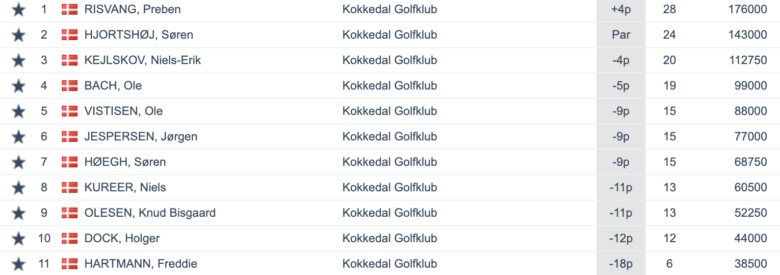 Vi var 12 tilmeldte, men en faldt fra og så var vi 11 tilbage ved lodtrækningen og som spillede på en god bane med hurtige greens. Der blev derfor også lavet gode scores af to spillere, som gik til deres handicap eller bedre - Preben Risvang blev 1'er med en score på 28 point - flot - og Søren Hjortshøj med 24 point blev 2'er - det er iøvrigt 3 gang ud af 3 runder Søren er blevet 2'er - superflot.